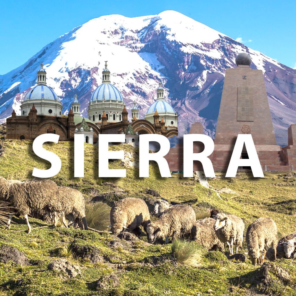 Majestuosa Pacha Mama de los Andes, aventurémonos en la sierra ecuatoriana con su hermoso camino de los valles y los volcanes, una vista majestuosa color verde y oro. Con sus impactantes ciudades como la Carita de Dios y la Atenas del Ecuador, (Quito y Cuenca) con sus tesoros históricos y culturales han sido declarados Patrimonio culturales de la humanidad.