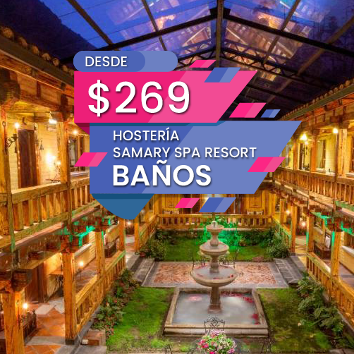 Ofertas Sierra Ofertas Sierra EXPERIENCIA ANDINA - CHIMBORAZO 2 días - 1 noche Incluye: 1 noche de alojamiento en el Hotel El Altar 4* en Riobamba. Transfer hotel – volcán Chimborazo – hotel Actividades, guiadas por personal autorizado. Box Lunch. Y más. Actividades: Trekking a los refugios Carrel y Whymper del Volcán Chimborazo. Ascenso hasta la laguna de Cóndor Cocha ubicada a los 5.100 m.s.n.m. Visita al Bosque de Polylepis. Riobamba city tour. Ver oferta DOS CHORRERAS - CUENCA 2 días - 1 noche Incluye: Noche de alojamiento en la Hostería Dos Chorreras en Cuenca. Visita a las cascadas Dos Chorreras. Transporte hacia la cascada. Jacuzzi en la habitación. Y más. Ver oferta BAÑOS DE LUJO 3 días - 2 noches Incluye: 2 noches de alojamiento en Samary Spa Resort. Desayunos. Acceso a la piscina, sauna, turco, polar e hidromasaje. 1 actividad de aventura a elegir (escalada o canyoning). Y más. Ver oferta Ofertas que te pueden interasar Ver ofertas Ver ofertas Ver ofertas